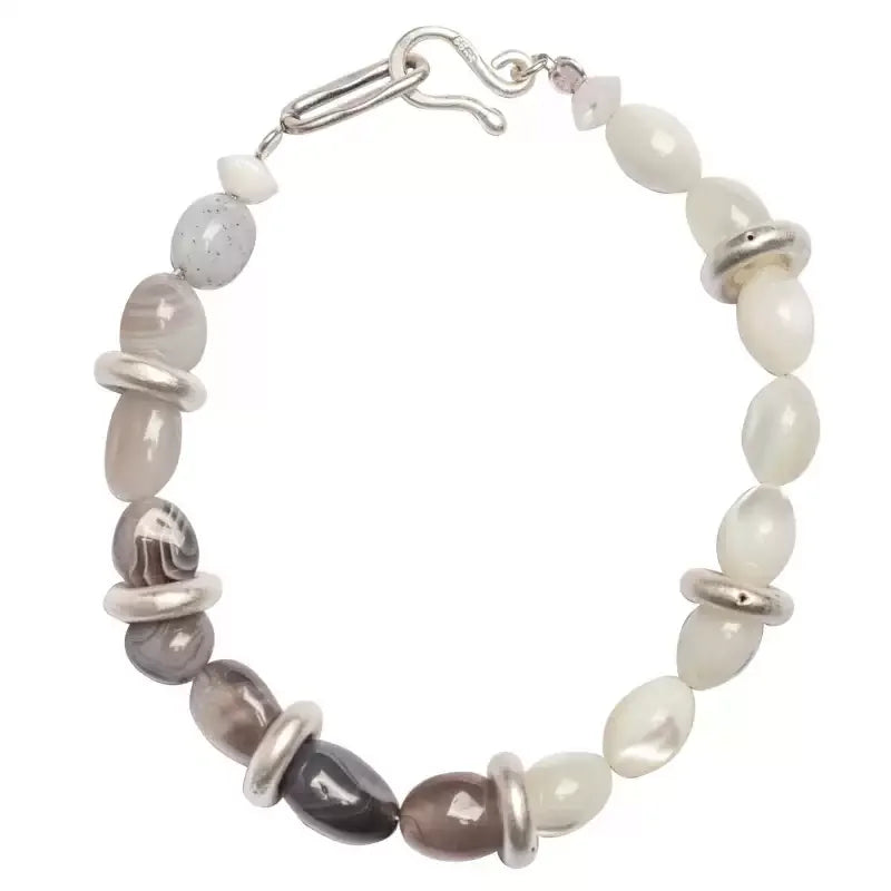 The Inkwell Agate Bracelet is designed around the quiet power of natural materials. Each bead—shifting between misty gray and earthy brown—captures the raw rhythm of stone shaped over time. Paired with slim silver spacers, the bracelet reflects a modern, understated aesthetic that lets the stone’s natural voice speak. It’s crafted for those who prefer subtle strength, grounded presence, and design that values authenticity over ornament.