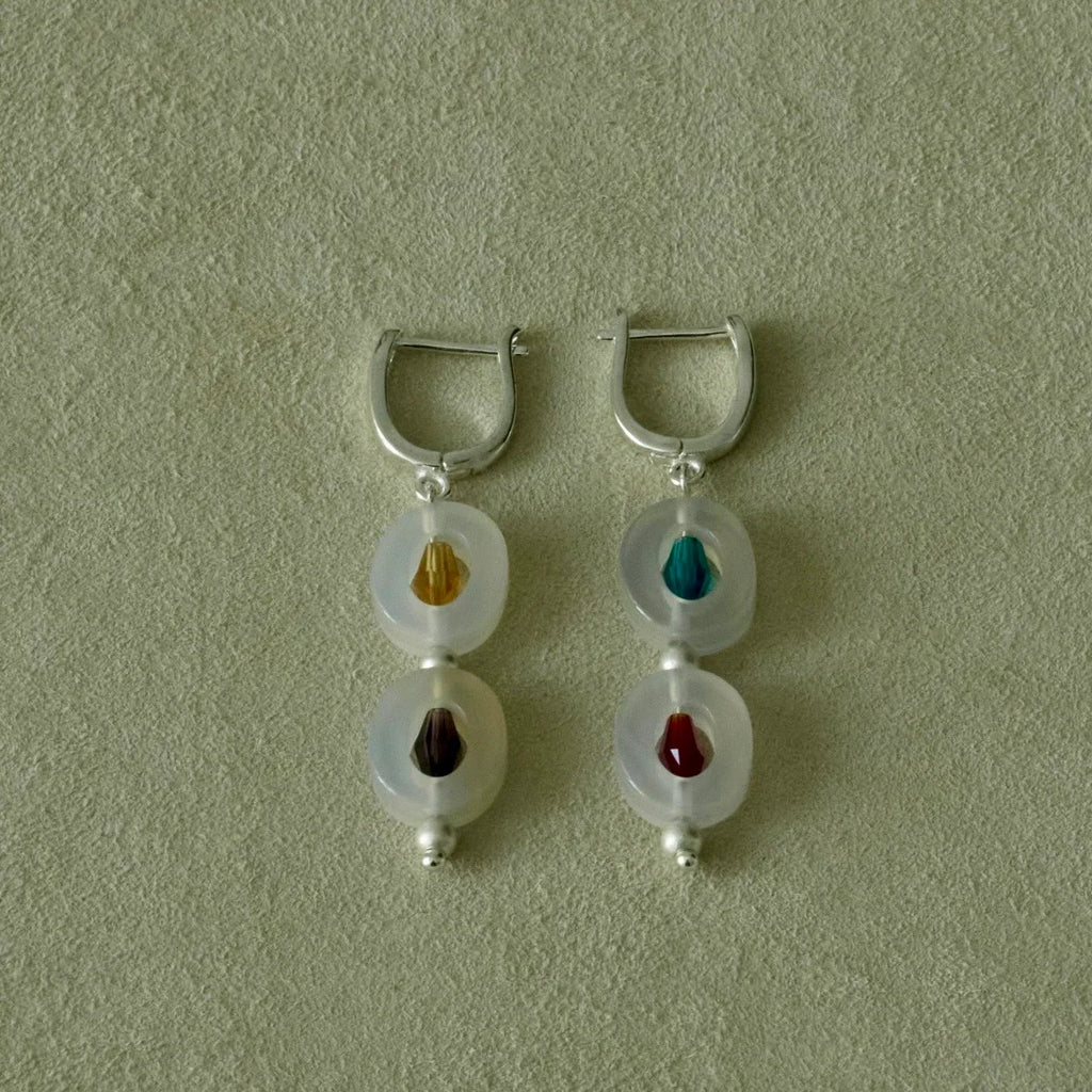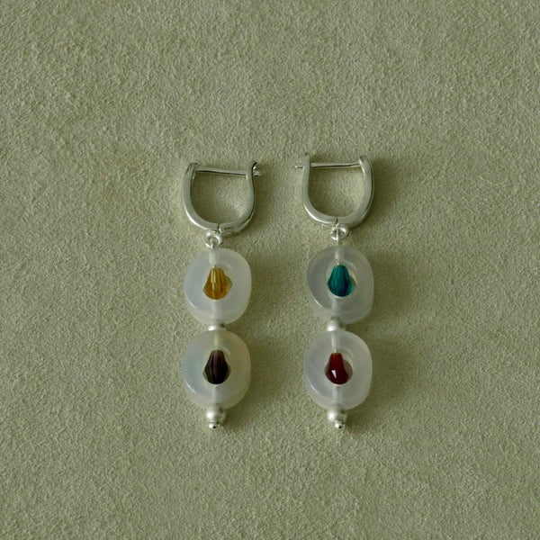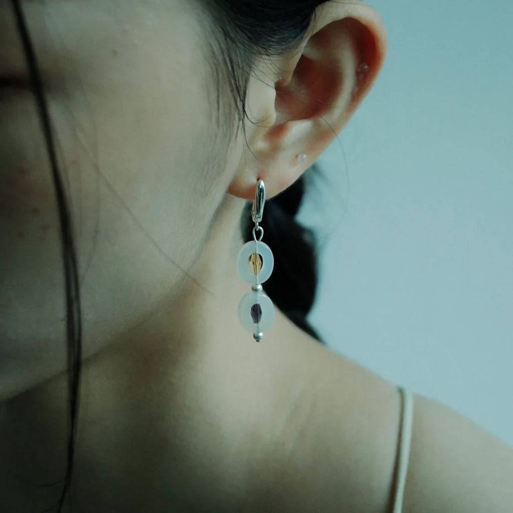 Inspired by Tibetan mandala sand art philosophy, these earrings feature simple round white agate discs accented with colorful gemstones. The dual-layer structure symbolizes harmony between the outer world and inner self. Asymmetrical gemstone placement represents the balanced diversity of life.