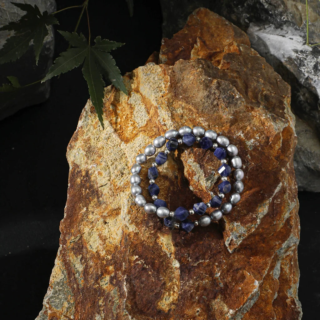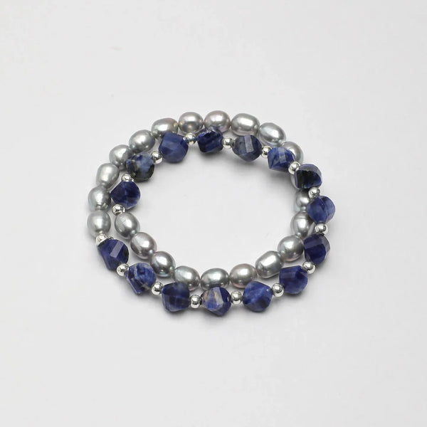 This double-wrap bracelet embodies a soft, layered rhythm of misty blue. Blue larimar-style beads and gray freshwater rice pearls weave together to create a calm, expressive, and graceful wrist accessory.