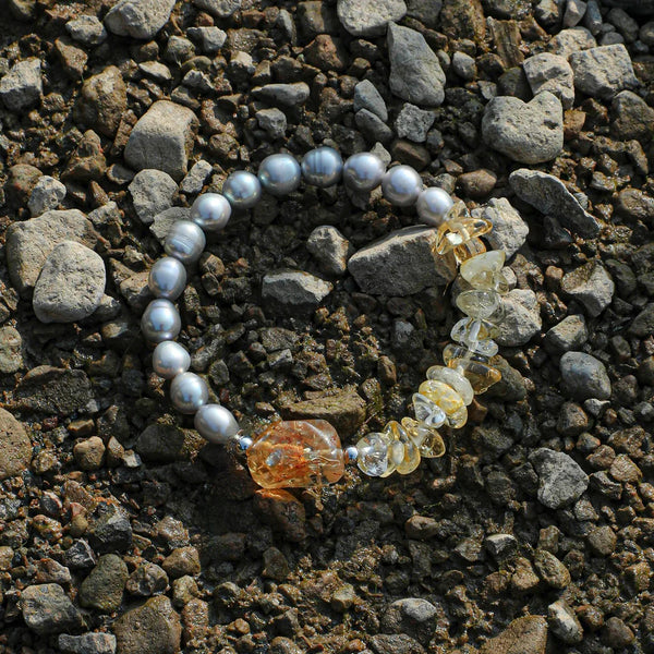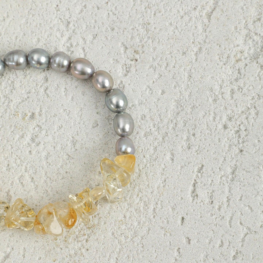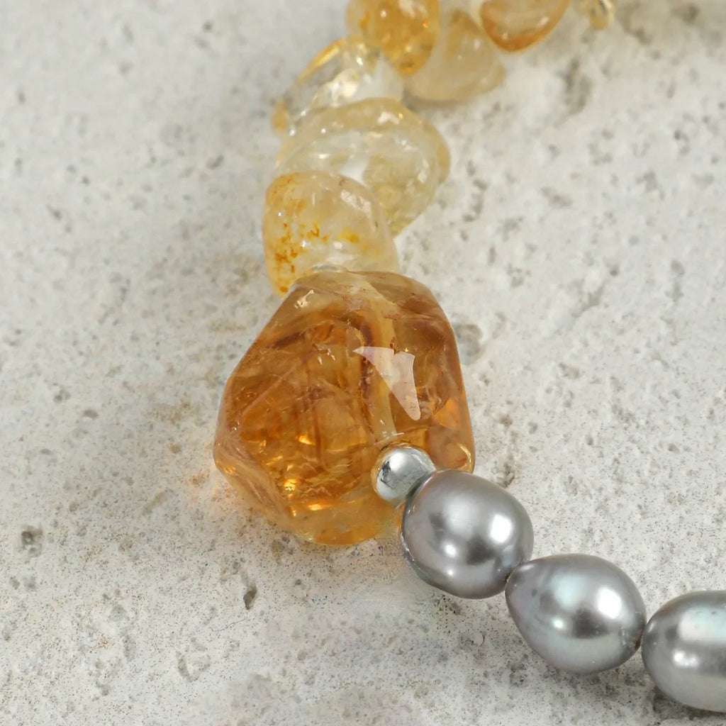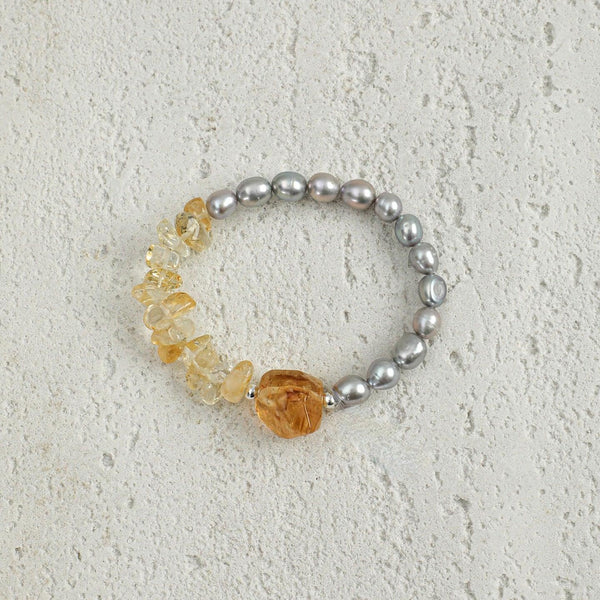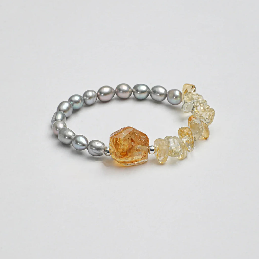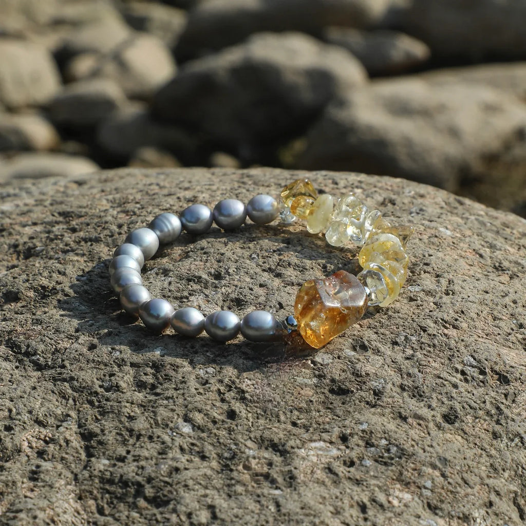 This bracelet functions as a dynamic abundance loop. Citrine activates personal power, ambition, and optimism, encouraging movement toward growth and opportunity. Grey pearls stabilize this momentum, preventing impulsiveness and supporting thoughtful, grounded decisions. Together, they create a rhythm of confident action guided by inner wisdom—ideal for periods of growth, transition, or new beginnings.