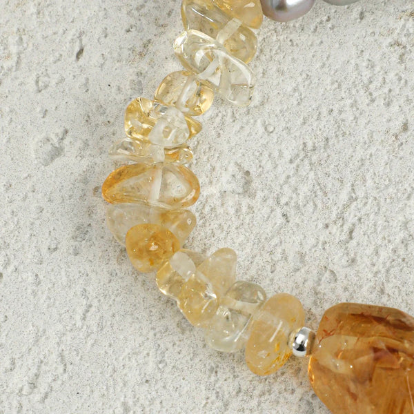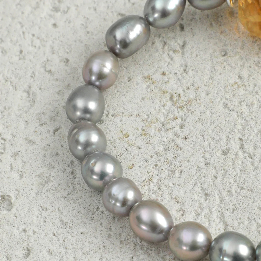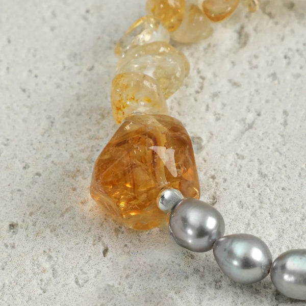 This bracelet is crafted from natural citrine (raw and faceted fragments), grey freshwater pearls, and sterling silver accents.