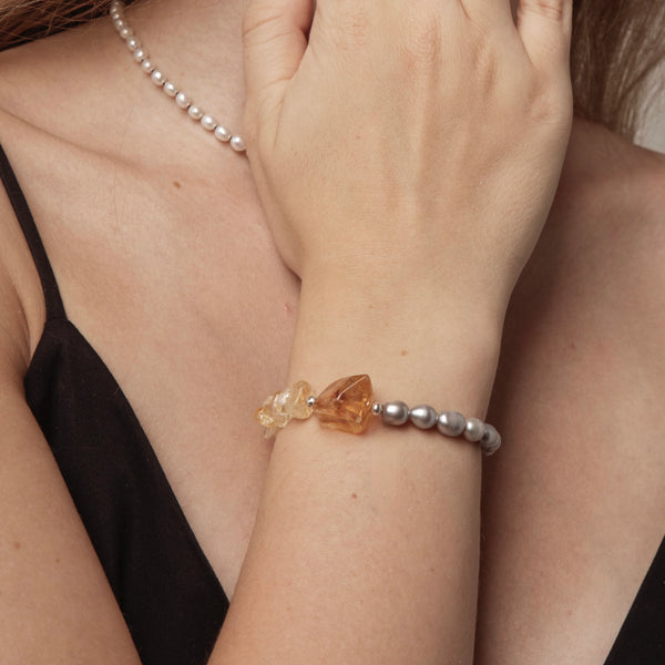 Inspired by sunlight breaking through morning mist and the quiet warmth of dusk, this bracelet explores the balance between expansion and restraint. Raw citrine—left intentionally organic in form—meets softly luminous grey pearls, creating a dialogue between vibrant action and grounded wisdom. Citrine appears like fractured sunlight, alive and radiant, while grey pearls settle the composition with calm depth. Designed with an effortless, unforced rhythm, this piece wears like a small landscape on the wrist—reminding you to move forward with clarity, confidence, and composure.