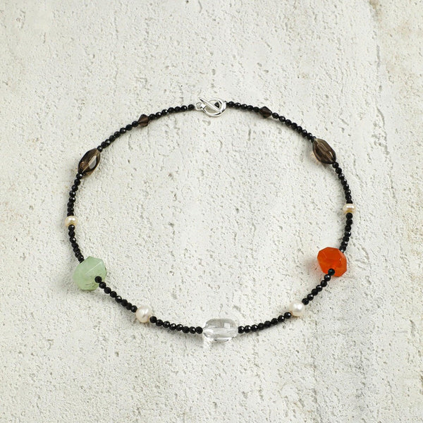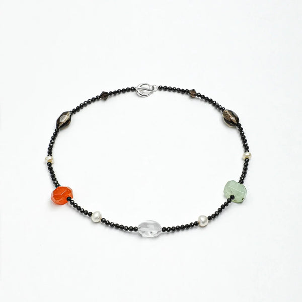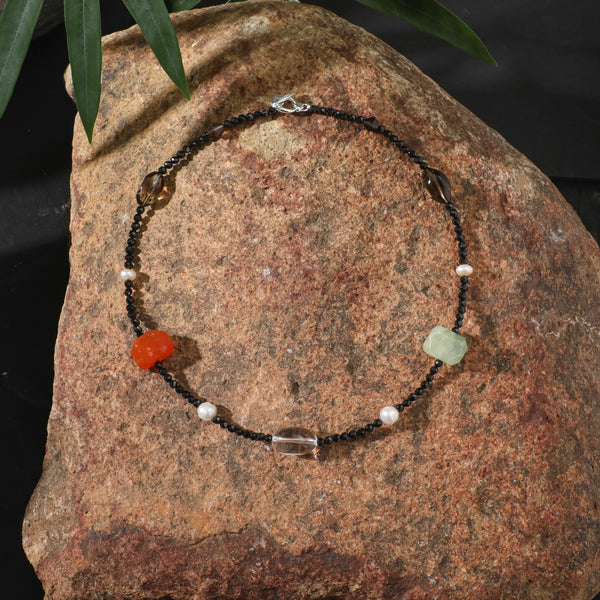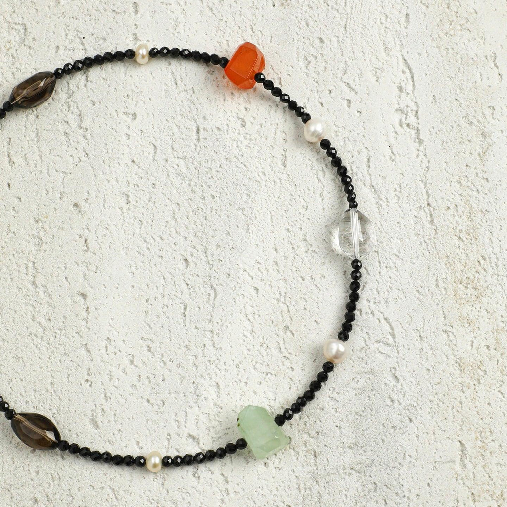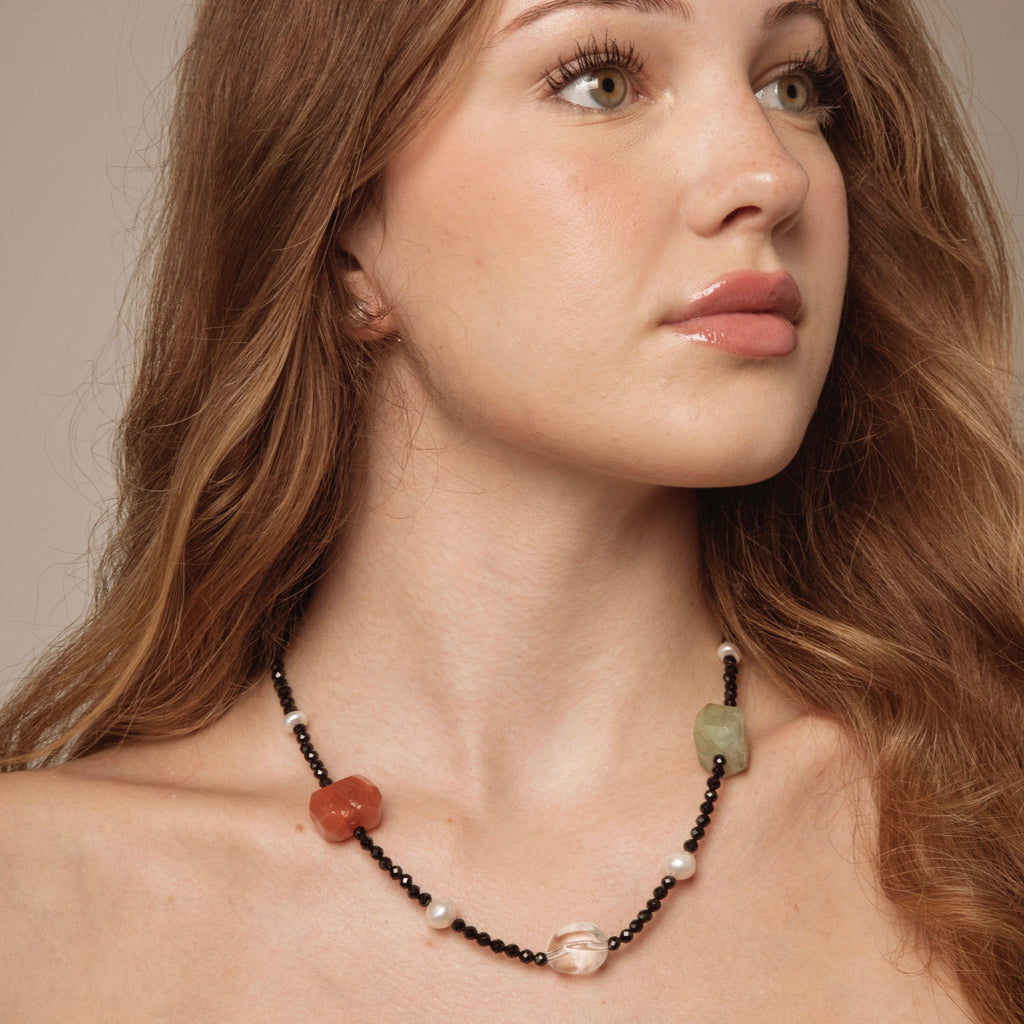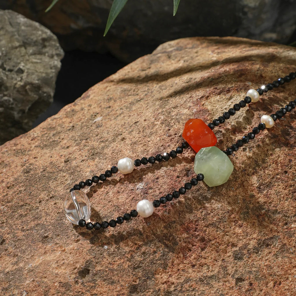 Inspired by the idea of a personal energy micro-garden, this necklace is designed as a living landscape rather than a symmetrical ornament. Faceted black tourmaline forms a grounding path, while prehnite, smoky quartz, clear quartz, pearls, and warm-toned stones appear like naturally scattered elements — leaves, fruits, light, and water.