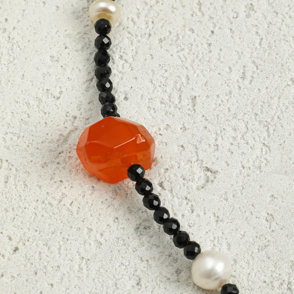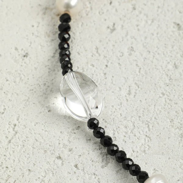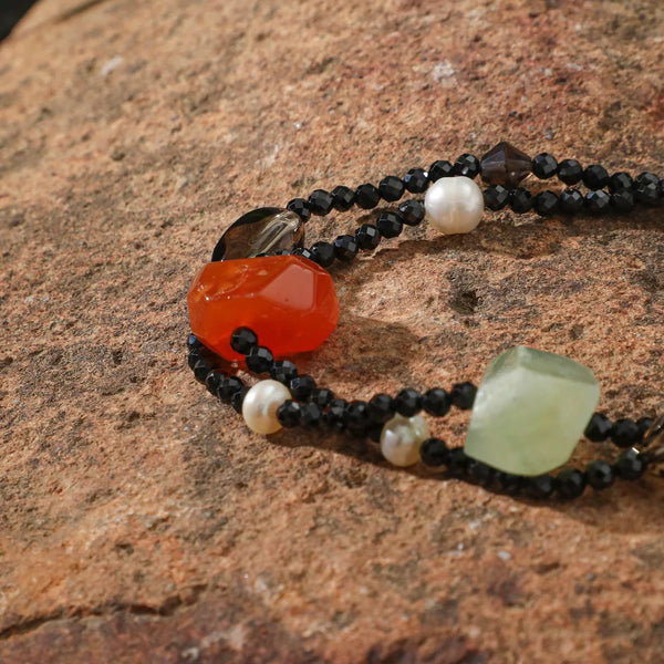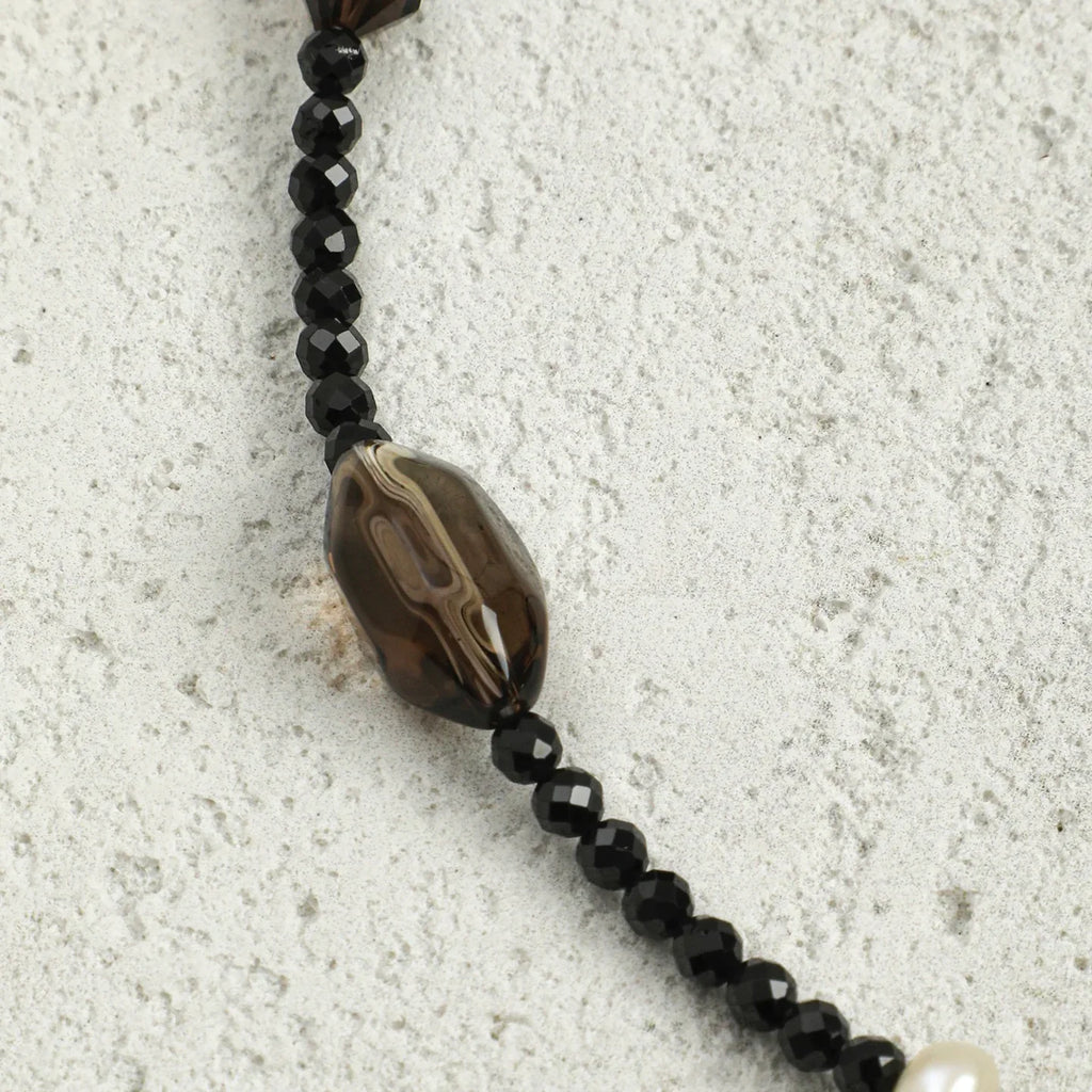 From the cool polish of tourmaline to the soft luster of pearls and the crystalline clarity of quartz, this piece offers rich tactile and visual contrast.