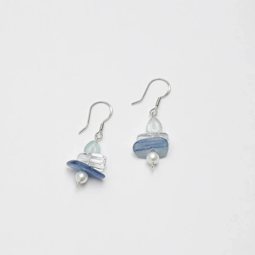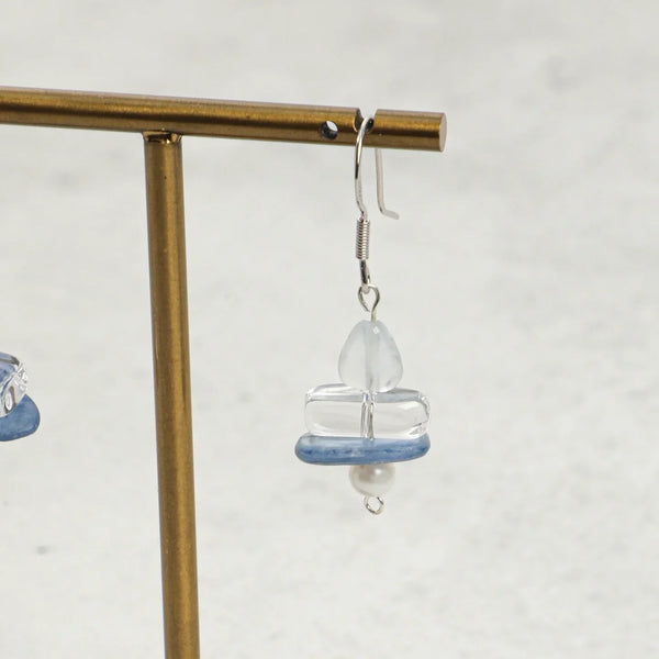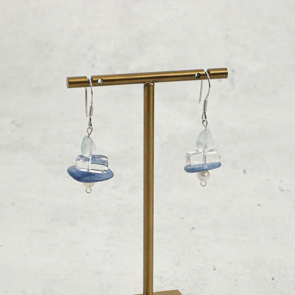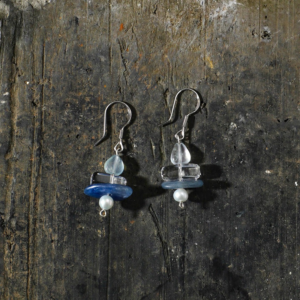Inspired by the energy flow from deep oceans to glaciers, these earrings combine aquamarine fragments, blue crystal tusks, clear quartz pillars, and small pearls into a vertical rhythm. This design embodies calm and self-expression—deep ocean blues settle the mind, ice-like crystals carve clarity, and pearls bring a harmonious resolution.