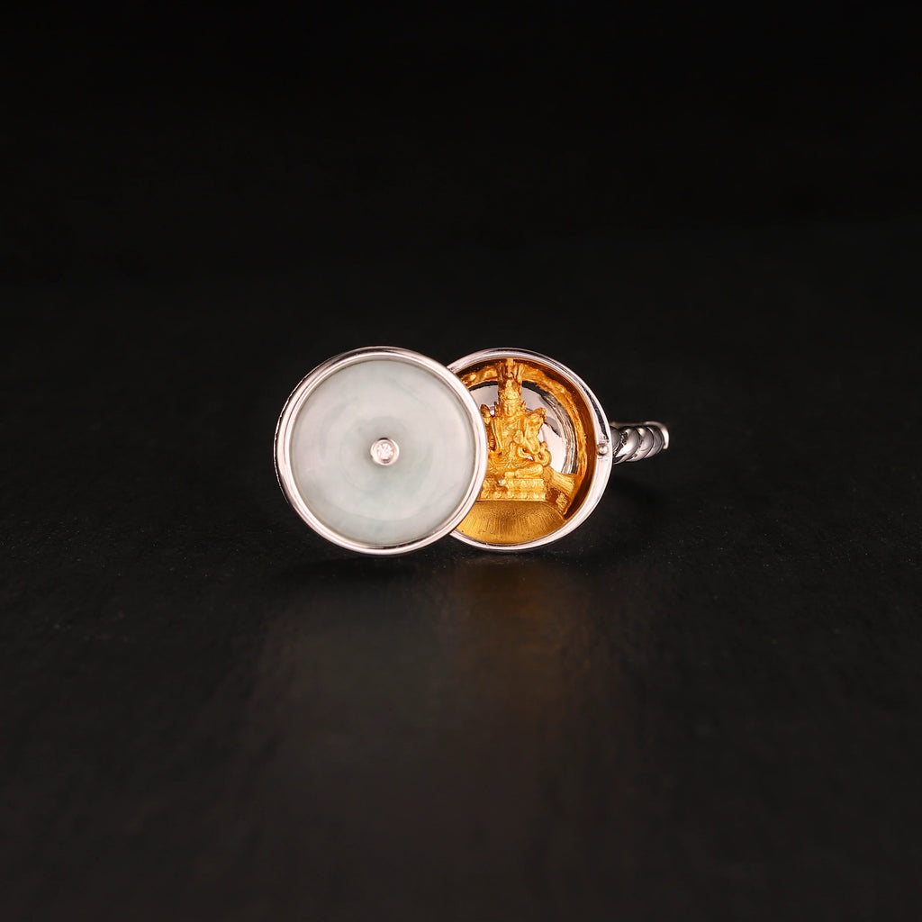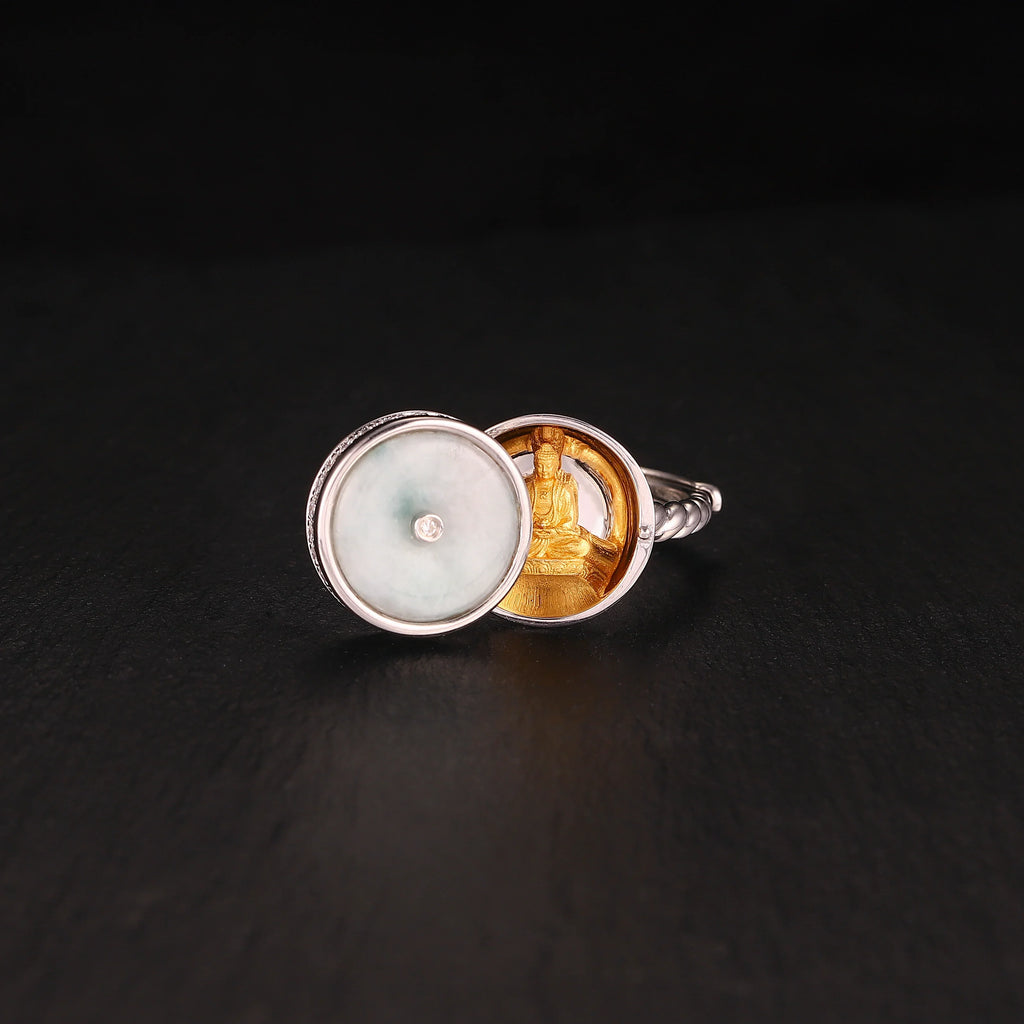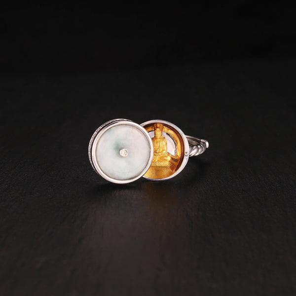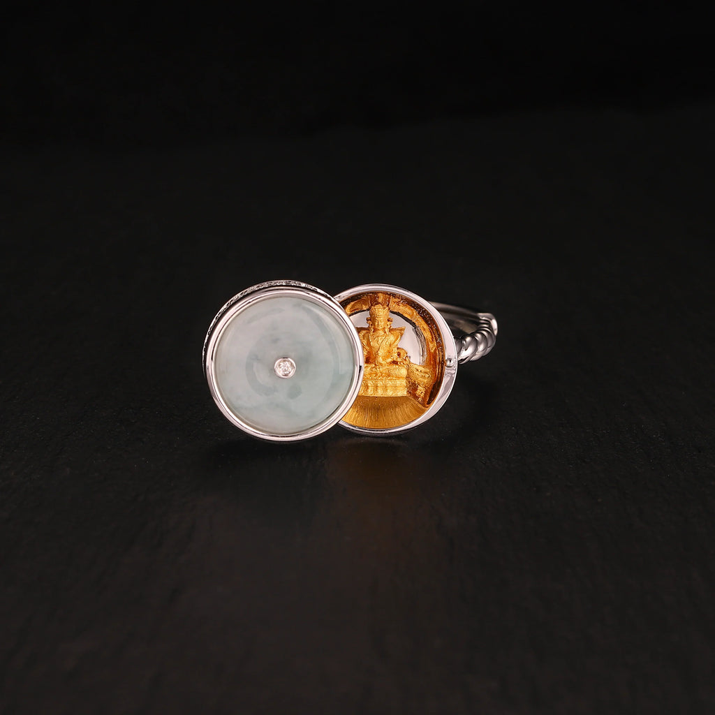 The true charm lies in its rotating opening design. Lift the ring face to reveal a delicate golden Buddha, creating a personal micro-sanctuary amidst everyday distractions. The combination of jade, gold, and diamond invites a meditative, reflective experience—reminding the wearer that true wisdom resides within.