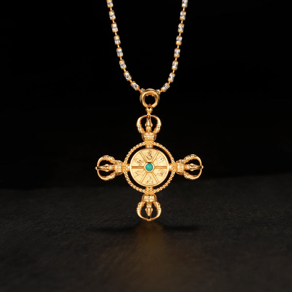 Accented with natural turquoise, the design softens the Vajra’s powerful geometry, creating a piece that feels protective yet grounded — a quiet symbol of inner strength worn close to the heart.