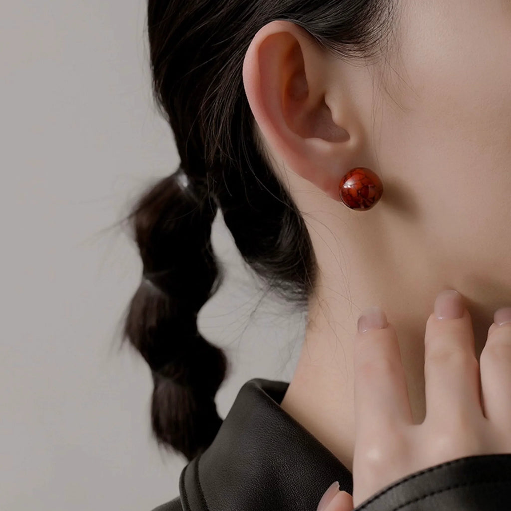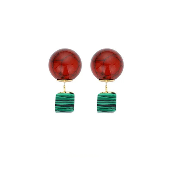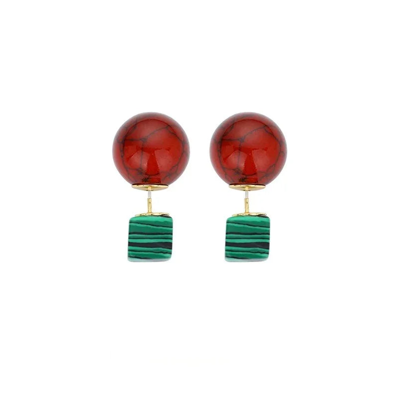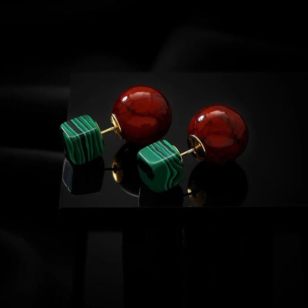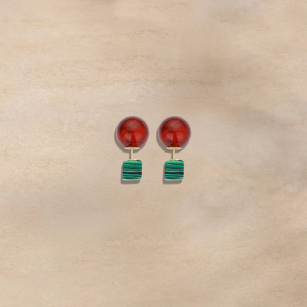 The Verdant Flash Earrings draw inspiration from the ancient philosophy of “Heaven is round, Earth is square.” A bold red jade bead rests above a polished malachite square, forming a striking geometric balance between softness and structure. The vivid red-and-green contrast creates an eye-catching visual rhythm, while the gold-tone connector threads the two elements together like a radiant line of energy. The design blends architectural clarity with the organic beauty of natural stone.