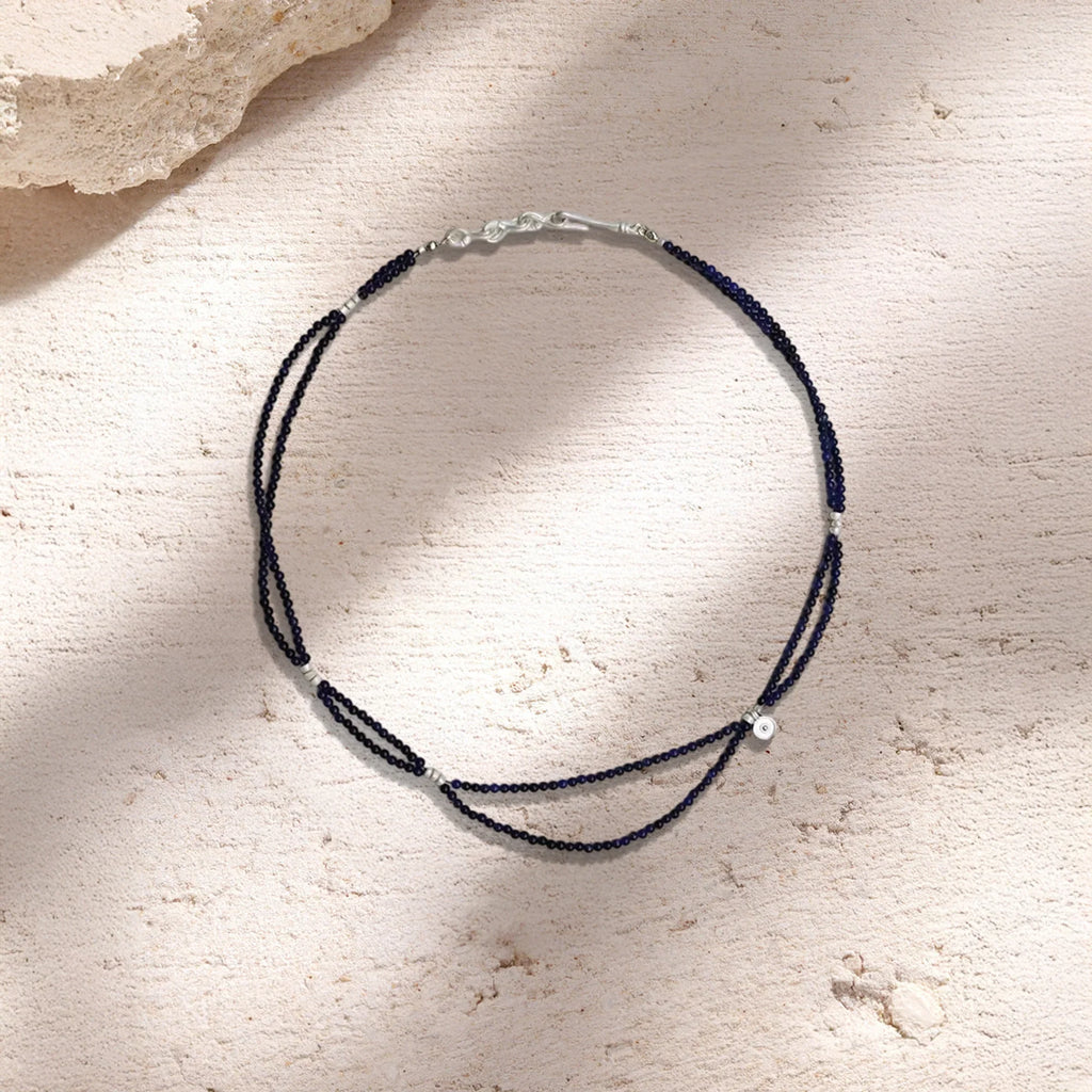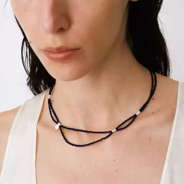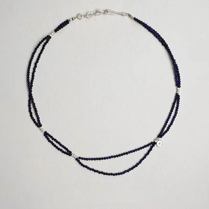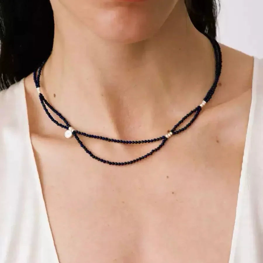 Crafted with shimmering blue goldstone beads, this layered necklace flows naturally around the neckline, evoking the quiet movement of the night sky.