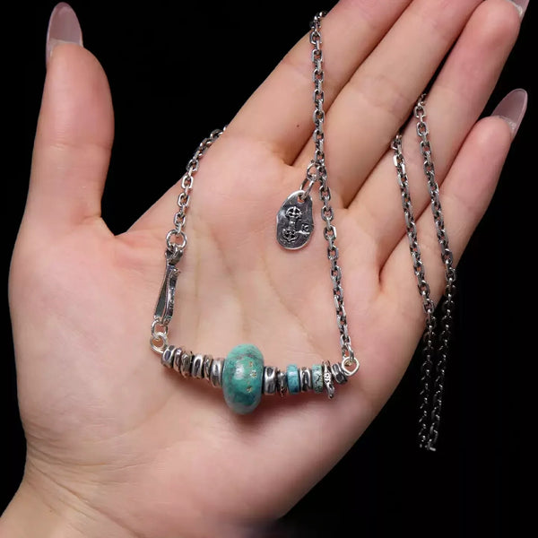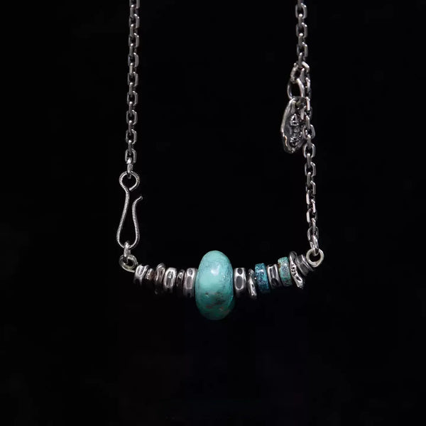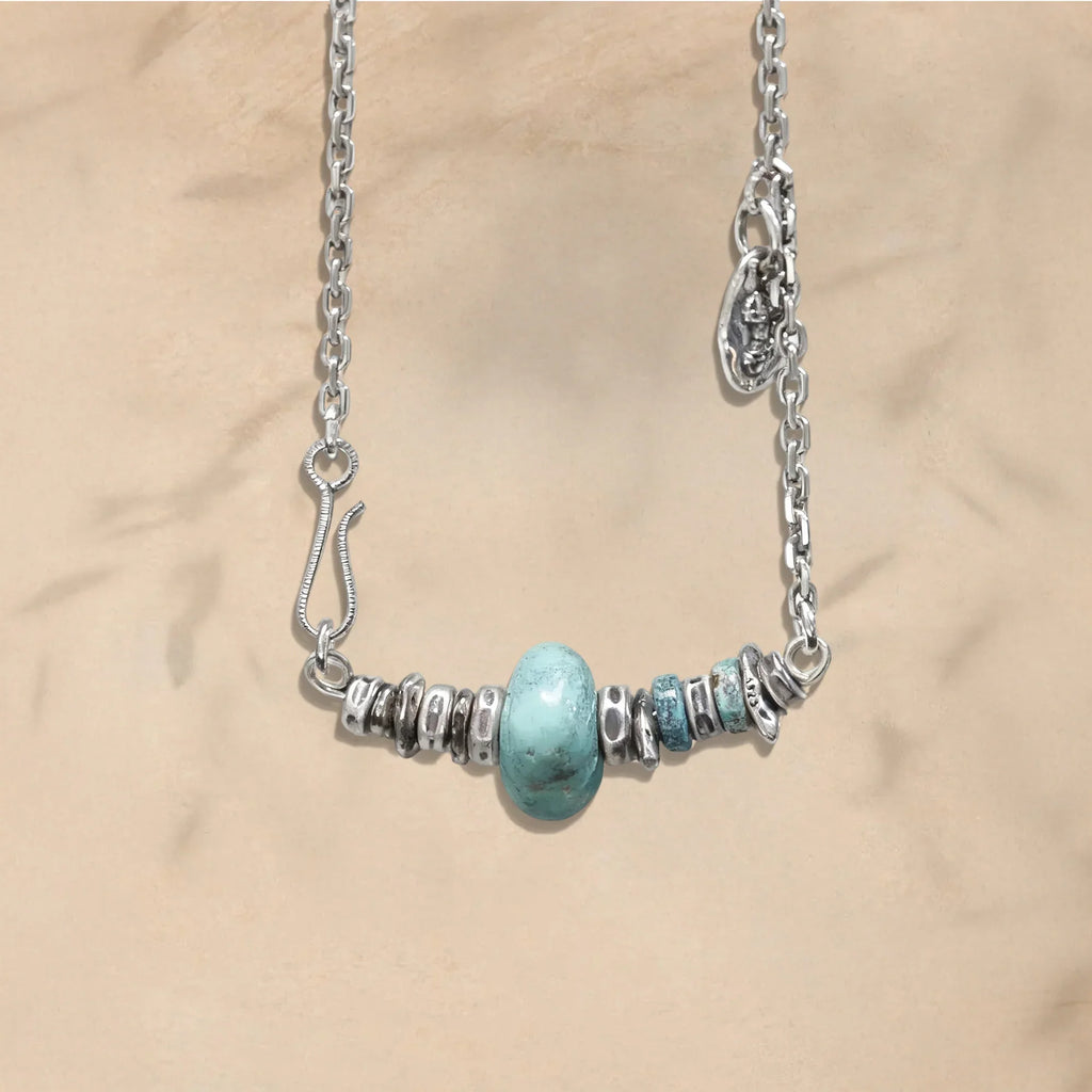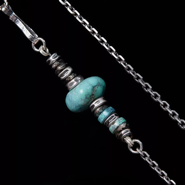 This handcrafted necklace combines the natural energy of turquoise with the timeless elegance of sterling silver, forming a balanced and meaningful piece. The rough-textured turquoise beads sit at the center, flanked by antique-finished silver spacers, creating a subtle, minimalist look that radiates quiet strength and spiritual resonance.