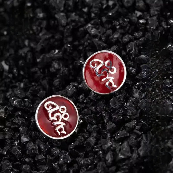 The Cinnabar Aura Earrings draw inspiration from traditional cinnabar, forming a bold round pendant delicately inlaid with silver wire tracing ancient Tibetan blessing characters. The flowing silver lines contrast strikingly with the fiery red cinnabar, as if eternal blessings are written across a crimson landscape. Edged with sterling silver, the design both protects the cinnabar and adds depth, while the smooth back ensures comfortable wear.